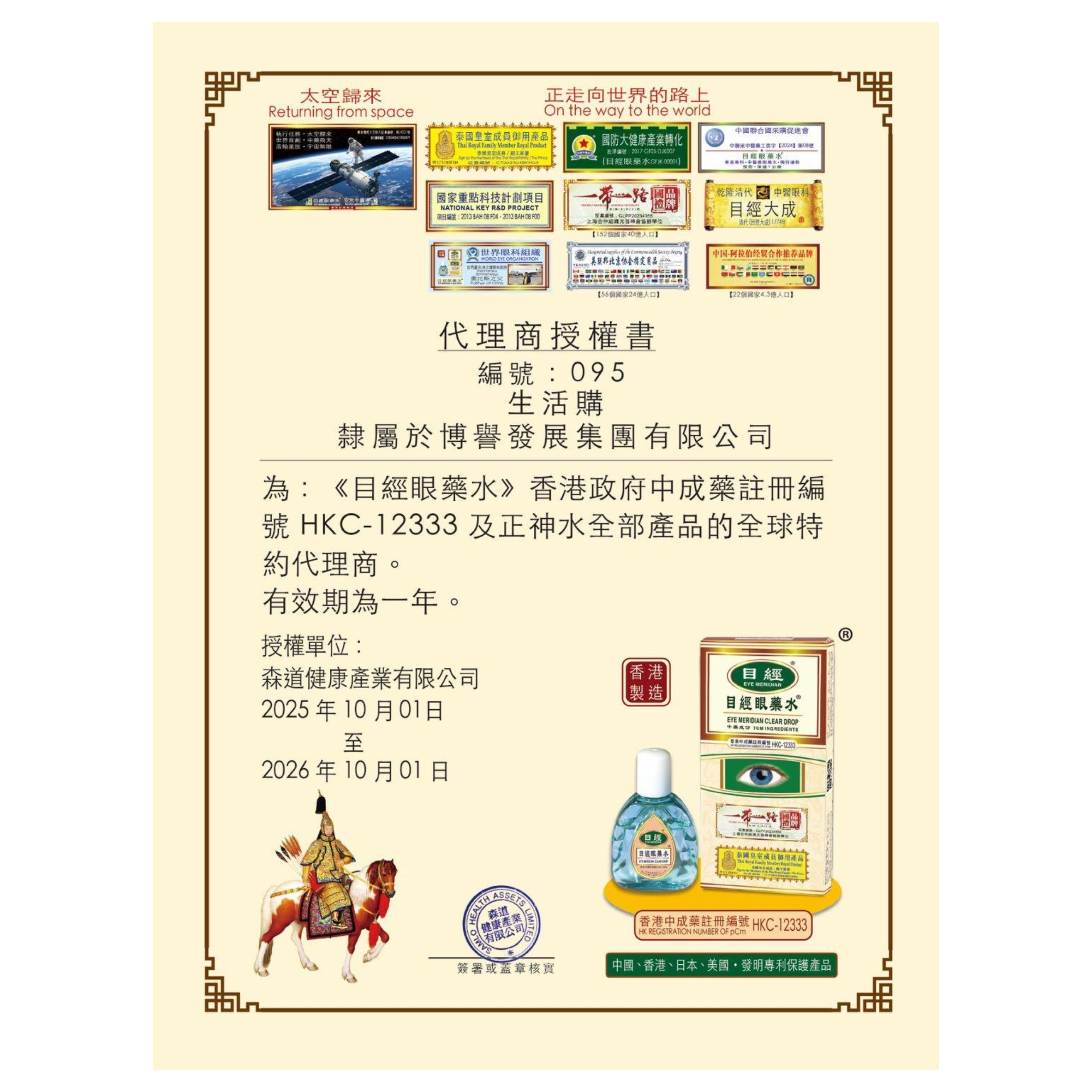 「目經眼藥水」以人參、體外培育牛黃、紅花等名貴中藥製成,是傳承清代「目經大成」眼科巨著的精髓,以天然草藥治療眼疾的香港註冊中成藥(註冊編號:HKC-12333),可養護近視眼、乾眼症、視疲勞、老花與電光性眼炎,亦有效改善眼底病,包括糖尿病視網膜病變、黃斑病、白內障等。 眼底病多基於眼底循環不佳,水腫,出血而引致疾病,而治療這些非手術能處理的難題,正是「目經眼藥水」的專長。 目經始於清朝乾隆皇帝御用中藥眼藥水,配方精純,工藝獨特,檢驗嚴謹,有效明目退翳,活血通絡,祛瘀止痛,清熱解毒,促進眼底血液循環。 有效成分:人參、體外培育牛黃、紅花、天然冰片(右旋龍腦)、茺蔚子、玄參等。 主治: 1.風火赤眼 (紅眼),即眼睛灼熱腫痛、怕熱畏光、迎風流淚、痕癢乾澀。 2.圓翳内障 (瞳仁白障),即瞳仁晶珠混濁、飛蚊星點、可視距離變近。 3.消渴目疾 (消渴上眼),即視物變形、視直如曲、物模糊有暗影、視力減退。 4.能近怯遠,即近距離清晰、遠距離模糊。 建議用法:每日2-3次,每次2-3滴。 製造地:中國與香港 注意事項請看包裝和內說明書,其中一項為「青光眼患者不適宜使用」,經食療主義查詢,發行商負責人表示,此產品並非對青光眼患者有害或不利,但研究顯示沒有效用。另外,開蓋後30天內使用是依循政府關於使用眼藥水的規定。